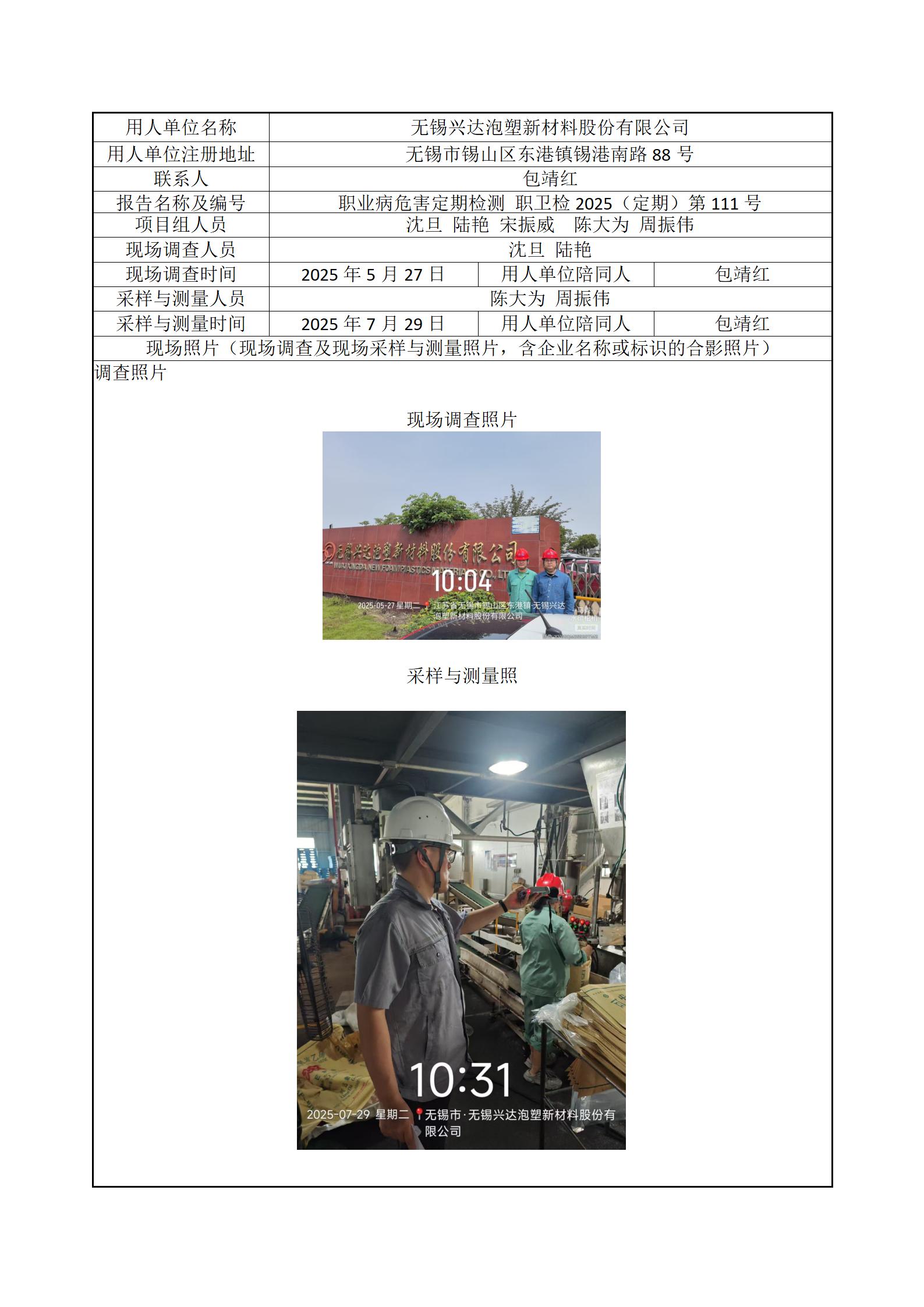 现场采样每日上报(无锡兴达泡塑新材料股份有限公司)