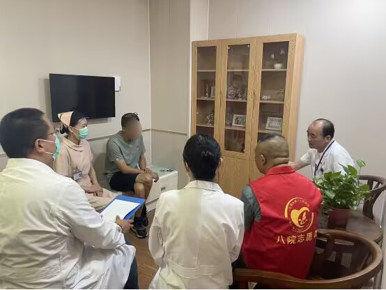 下午,在八院安宁疗护医护团队带领下,星光义工专职人员进入安宁病房。服务对象是一位膀胱癌晚期的卧床老人,老人因病情身体虚弱,身旁的家属首先对医护人员表示了衷心的感谢,并对八院安宁疗护和志愿服务表示赞扬。医护人员与家属共同向星光义工介绍了患者目前的病情与日常生活状况、兴趣爱好等,星光义工也根据老人实际情况,提出许多关于如何支持、照顾患者以及缓解其心理痛苦的诸多建议,帮助家属更好地让老人有尊严且舒适地度过生命的最后时光。