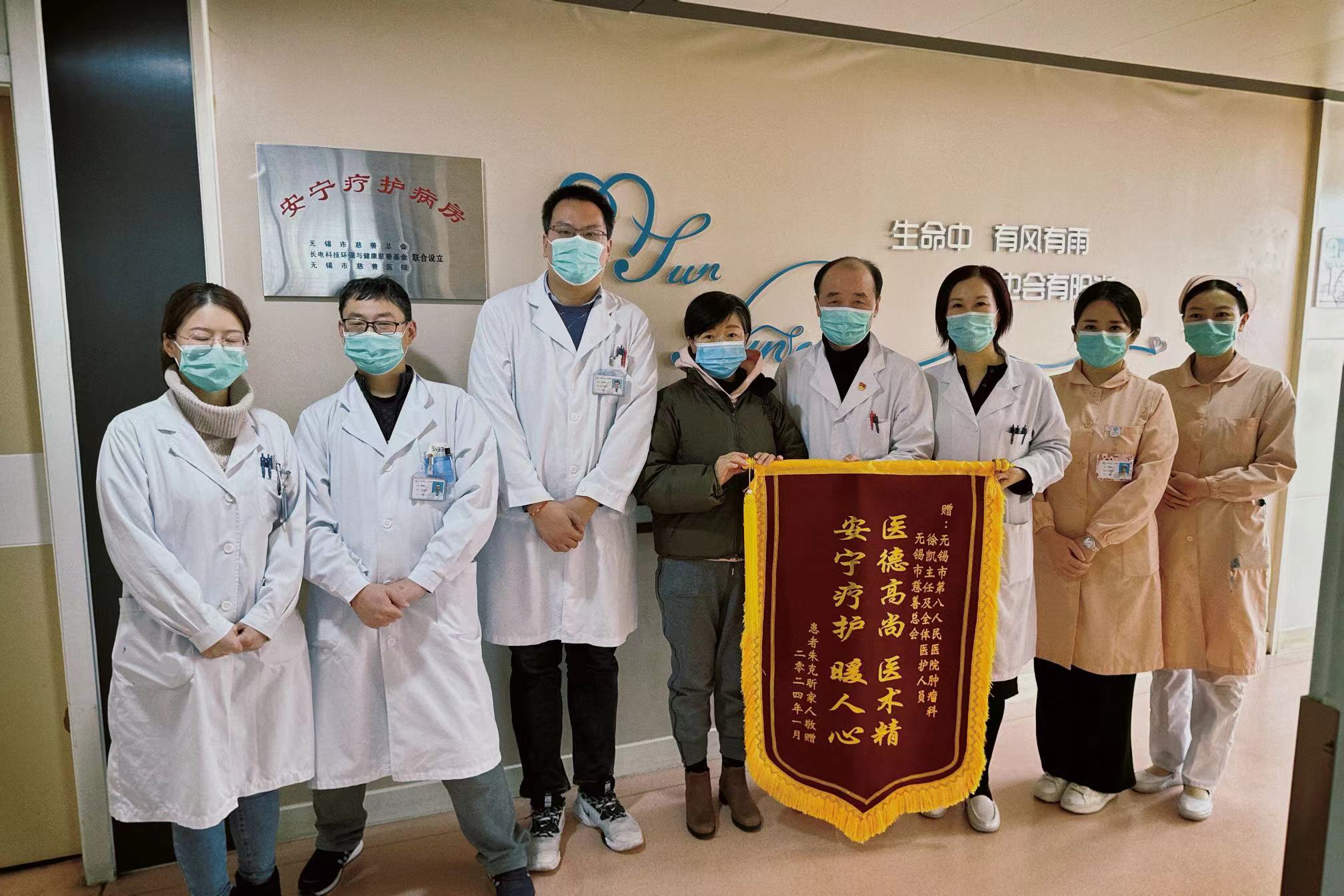 在全体医护人员的不懈努力下,患者的身体素质得到改善,体重增加了3斤,疼痛也得到了科学控制。为了表示对无锡市慈善总会和av片 的谢意,家属新的一年特意送来锦旗,感谢安宁疗护用专业的方法帮助患者提高生活质量,让终末期患者舒适、平静、尊严地离世,也希望这样的慈善之光能发扬光大,让慈善温暖更多有需要的家庭。