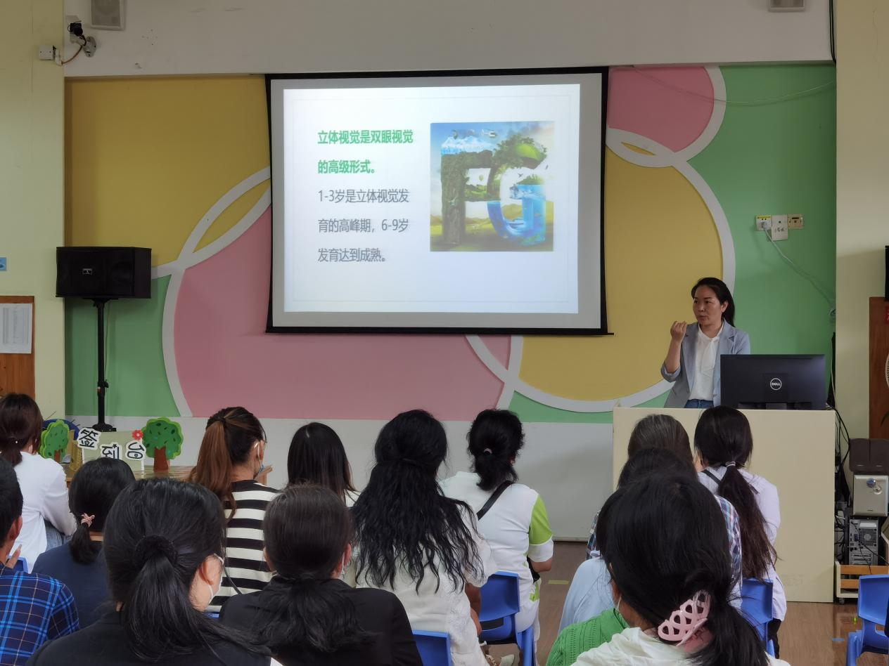 5月26日,av片 走进通江幼儿园,开展“保护眼睛,从我做起”主题科普知识讲座,眼科主治医师王晓培用专业的知识深入浅出地向各位家长阐述了眼睛的构成、近视的原因、防治方法,同时建议各位家长,在日常生活中,孩子的户外活动十分重要。特别是现在孩子普遍存在看电子屏幕时间长、近距离用眼多、户外活动少、读写姿势不良等情况,家长应帮助孩子养成健康的用眼习惯,遵循“3个20”护眼法则:即近距离用眼20分钟,向20米外远处眺望,眨眼20次。对已经发生近视的孩子,家长也应及时采取有效干预措施,延缓其近视度数加深,控制近视发展。