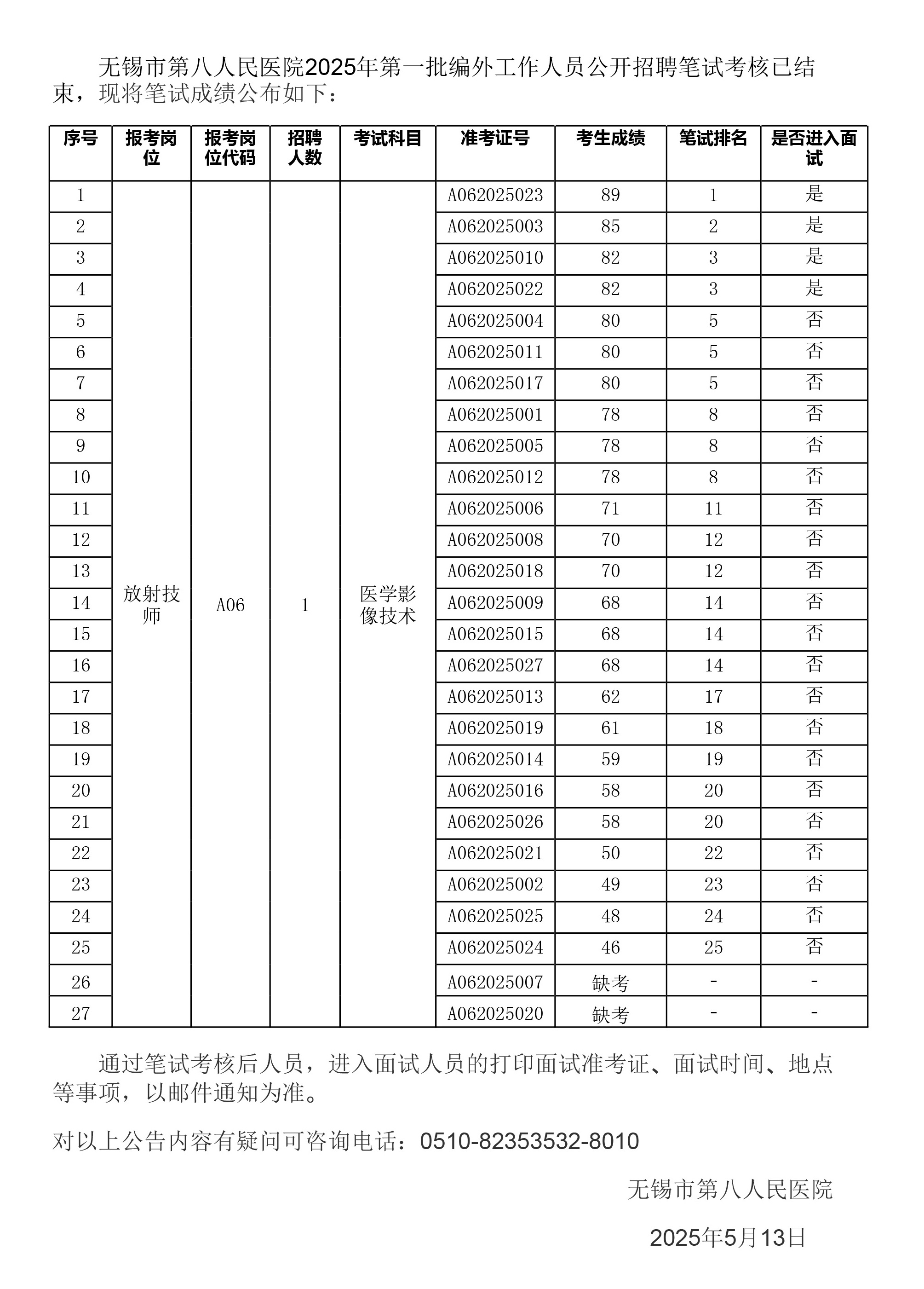 av片 2025年第一批编外工作人员 公开招聘笔试成绩公示